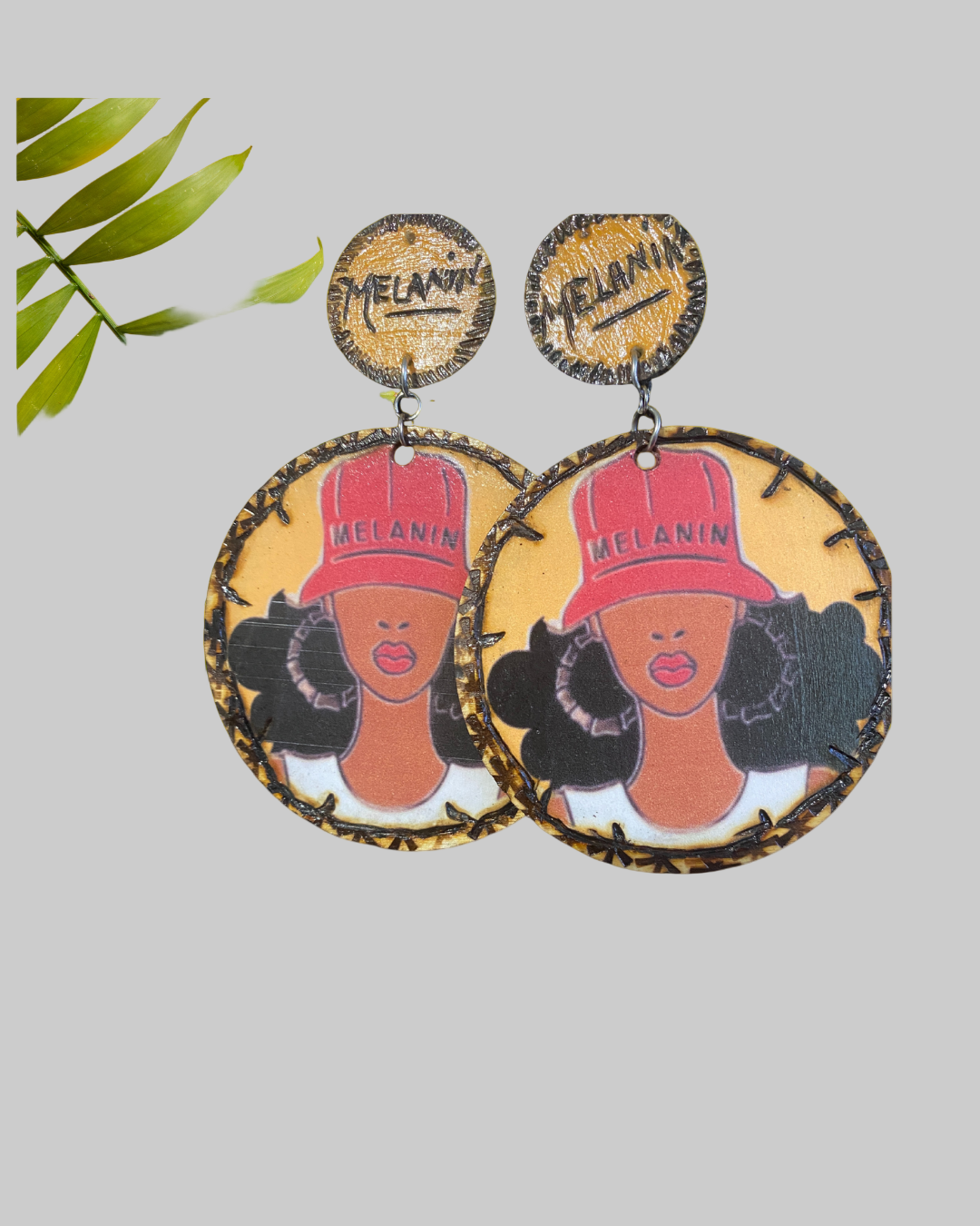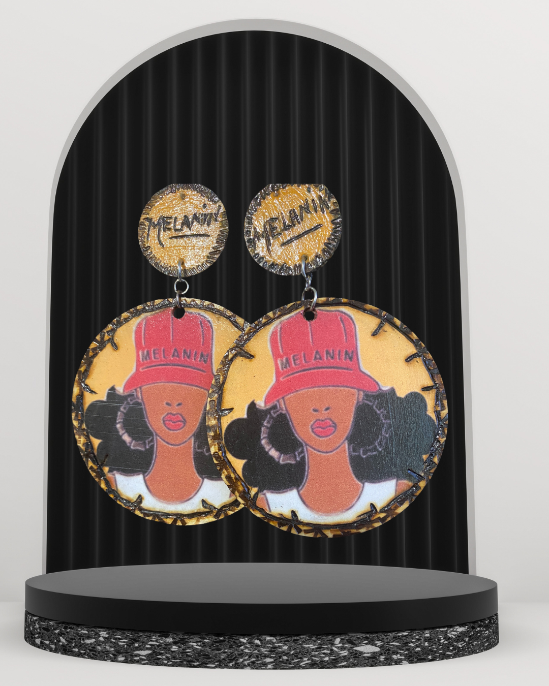 ✨ These handcrafted earrings feature a striking yellow circular design and a girl in a red cap. The "Melanin" text makes it a powerful statement piece. Perfect for celebrating culture and confidence, these earrings will enhance any outfit effortlessly. Their unique design honors diversity, allowing you to express your style with pride.