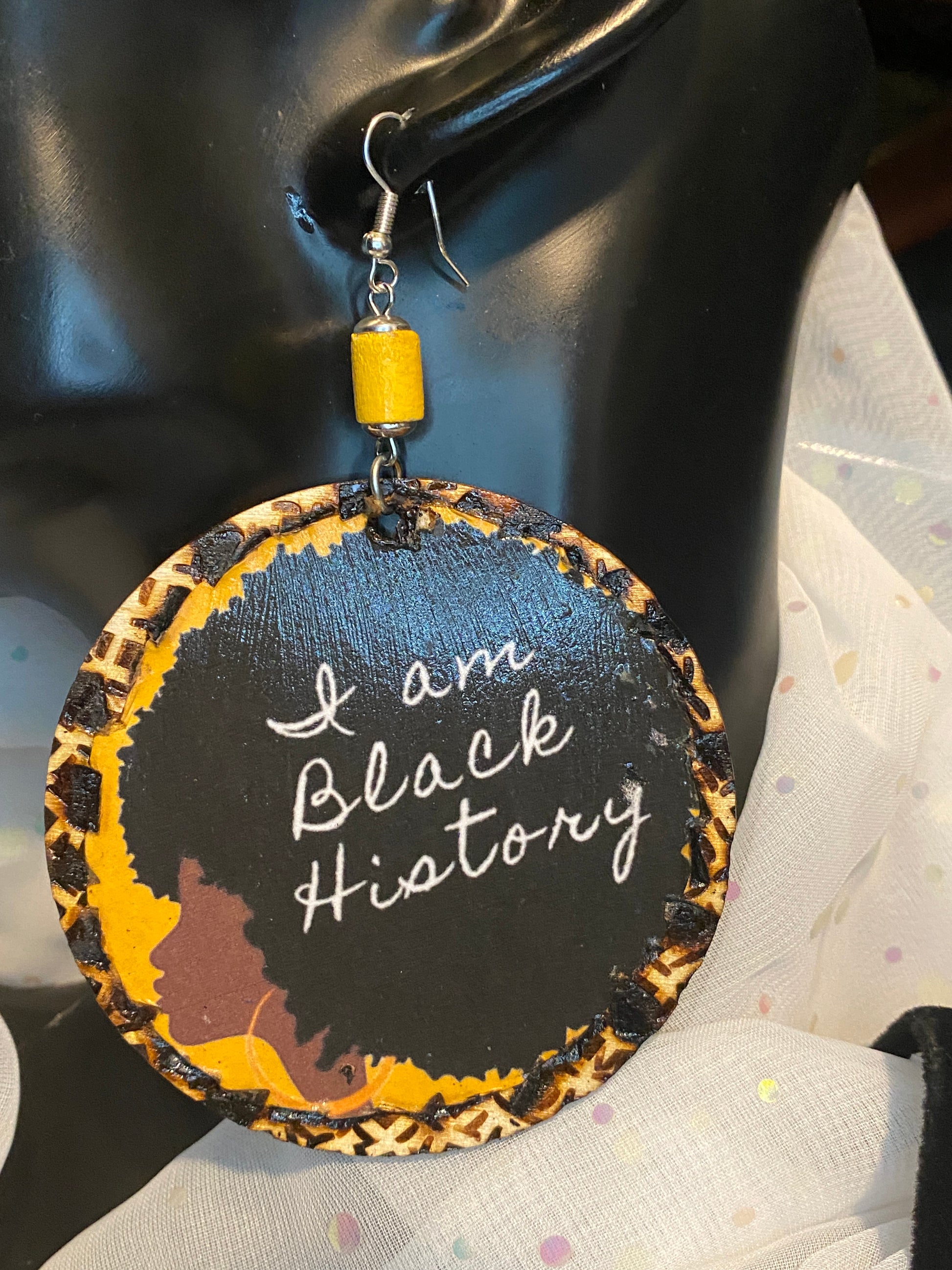 Celebrate heritage and style with the "Proud" earring, crafted from lightweight basswood for comfortable wear. This unique design represents a woman's afro, accented with a dark yellow bead to highlight cultural pride. The allergy-free hook ensures suitability for sensitive ears. Symbolize strength and identity with this distinctive accessory—an expert-crafted tribute to Black history and pride. Secure yours while supplies last.